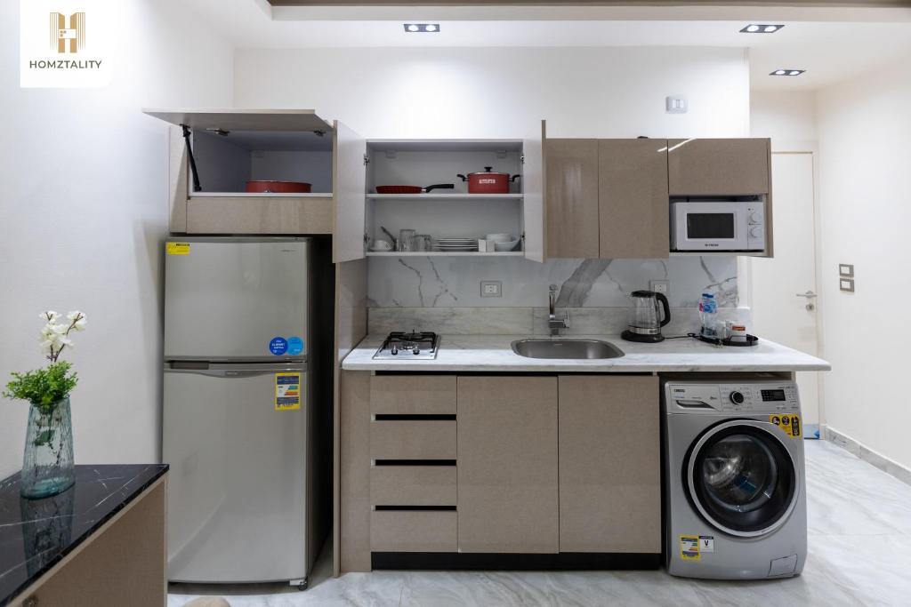Fully equipped kitchen featuring all necessary appliances, including microwave, refrigerator, washing machine, and modern kitchenware.